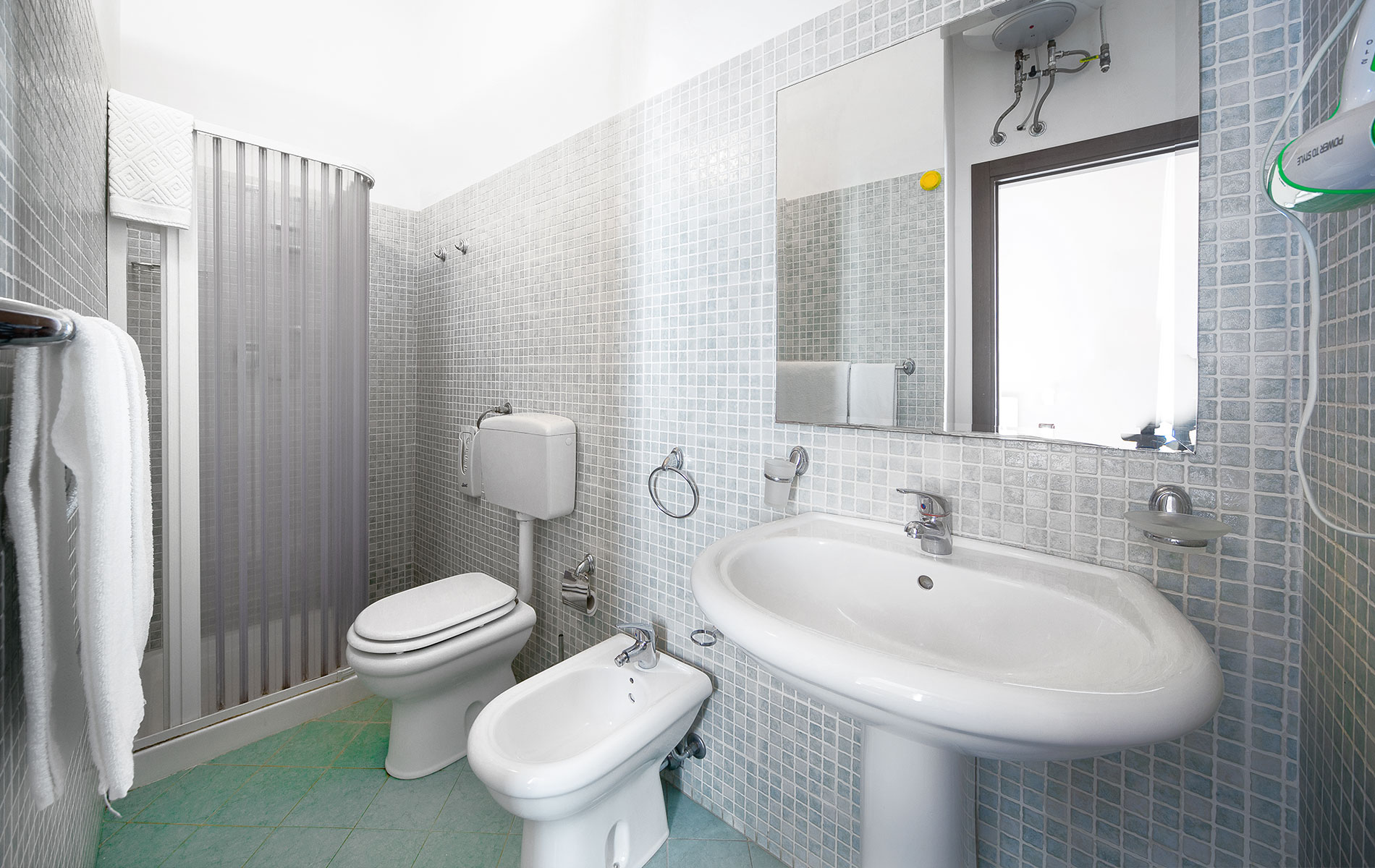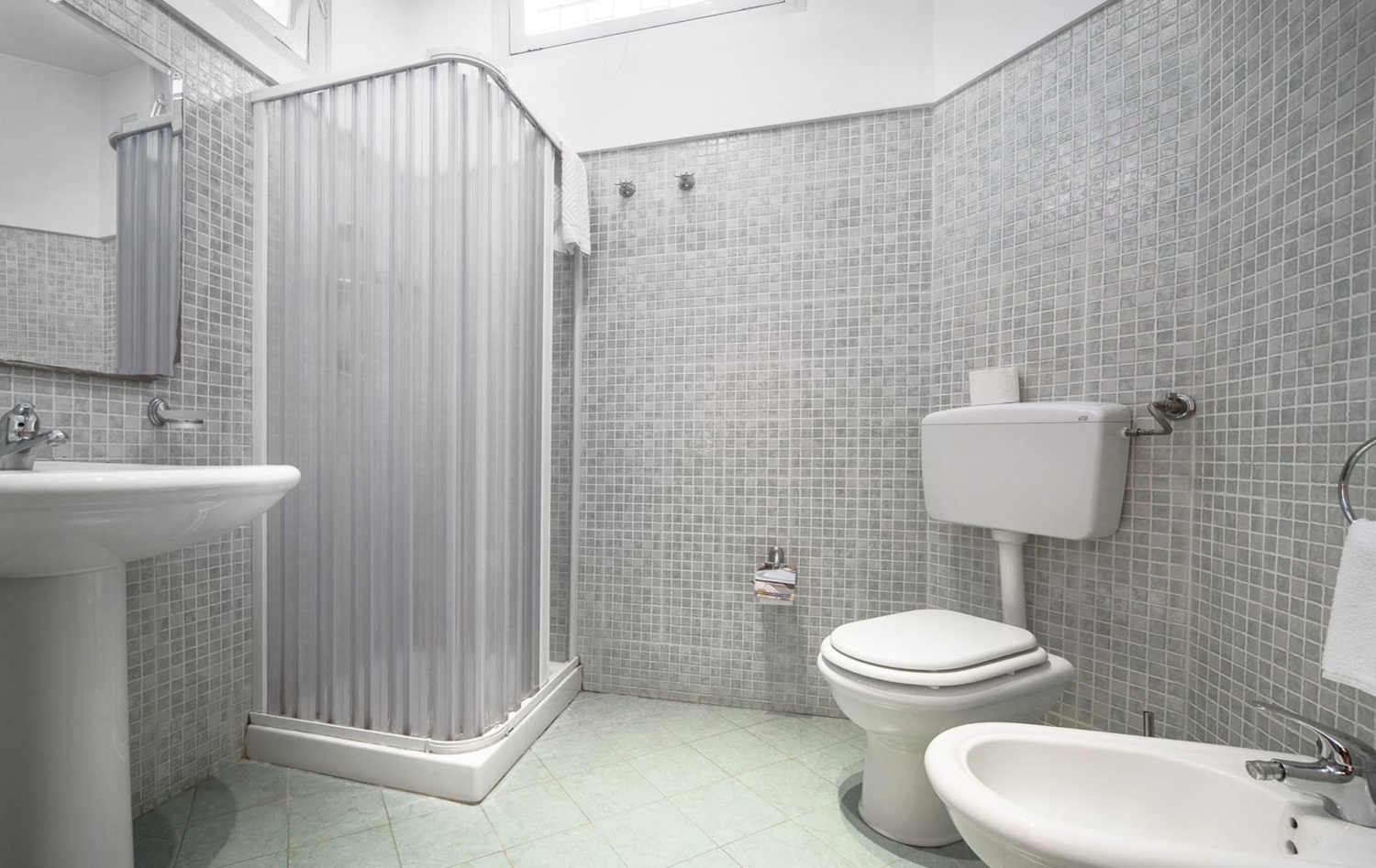 Bagno privato con doccia e soffione a pioggia, WC, bidet. Prodotti da bagno in omaggio, asciugamani, asciugacapelli